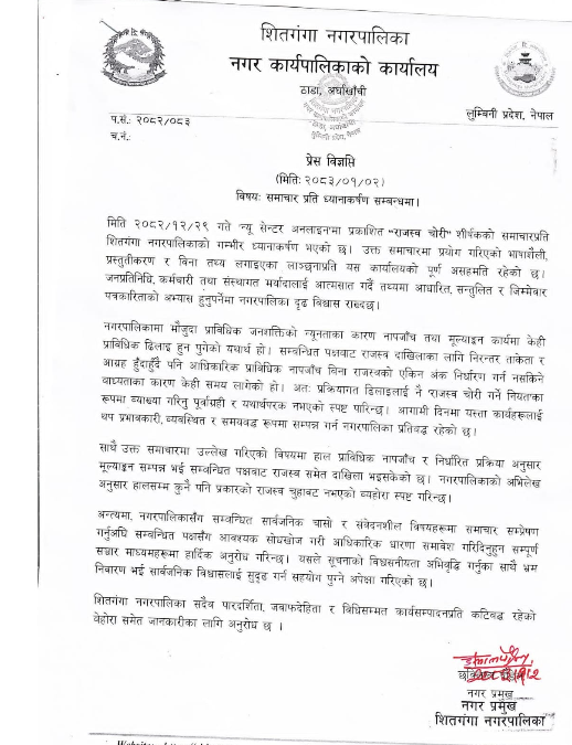 नगर प्रमुख पौडेलद्वारा हस्ताक्षरित उक्त प्रेस विज्ञप्तिमा सञ्चार माध्यमलाई जिम्मेवार र तथ्यमा आधारित समाचार प्रकाशन गर्न आग्रह गर्दै सितगंगा नगरपालिका सुशासन, पारदर्शिता र जवाफदेहिताको मार्गमा निरन्तर अगाडि बढ्ने उल्लेख गरिएको छ।