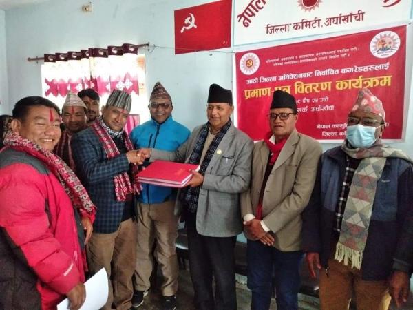 अर्घाखाँचीमा एमालेको आठौं जिल्ला अधिवेशनबाट निर्विरोध निर्वाचितलाई प्रमाणपत्र वितरण