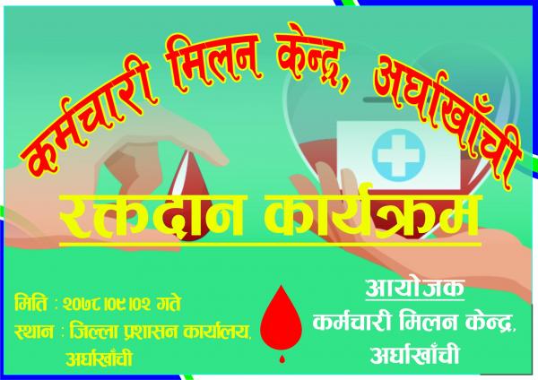 सन्धिखर्कमा कर्मचारी मिलन केन्द्रले यही शुक्रवार रक्तदान कार्यक्रम आयोजना गर्ने