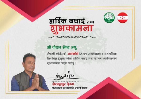 अर्घाखाँचीका नवनिर्वाचित कांग्रेस सभापति केशव श्रेष्ठलाई देउवाद्धारा बधाई व्यक्त