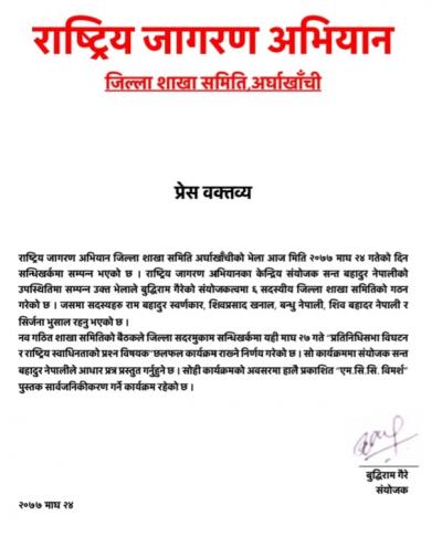 अर्घाखाँचीमा सन्त बहादुर नेपाली नेतृत्वको राष्ट्रिय जागरण अभियानको जिल्ला शाखा गठन