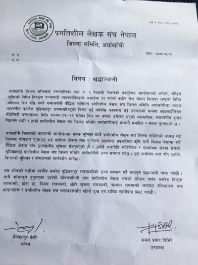 अर्घाखाँचीका कम्युनिस्ट नेता तथा पुर्व शिक्षक बुद्धि रायमाझीको निधनप्रति प्रगतिशील लेखक संघद्वारा शोक व्यक्त