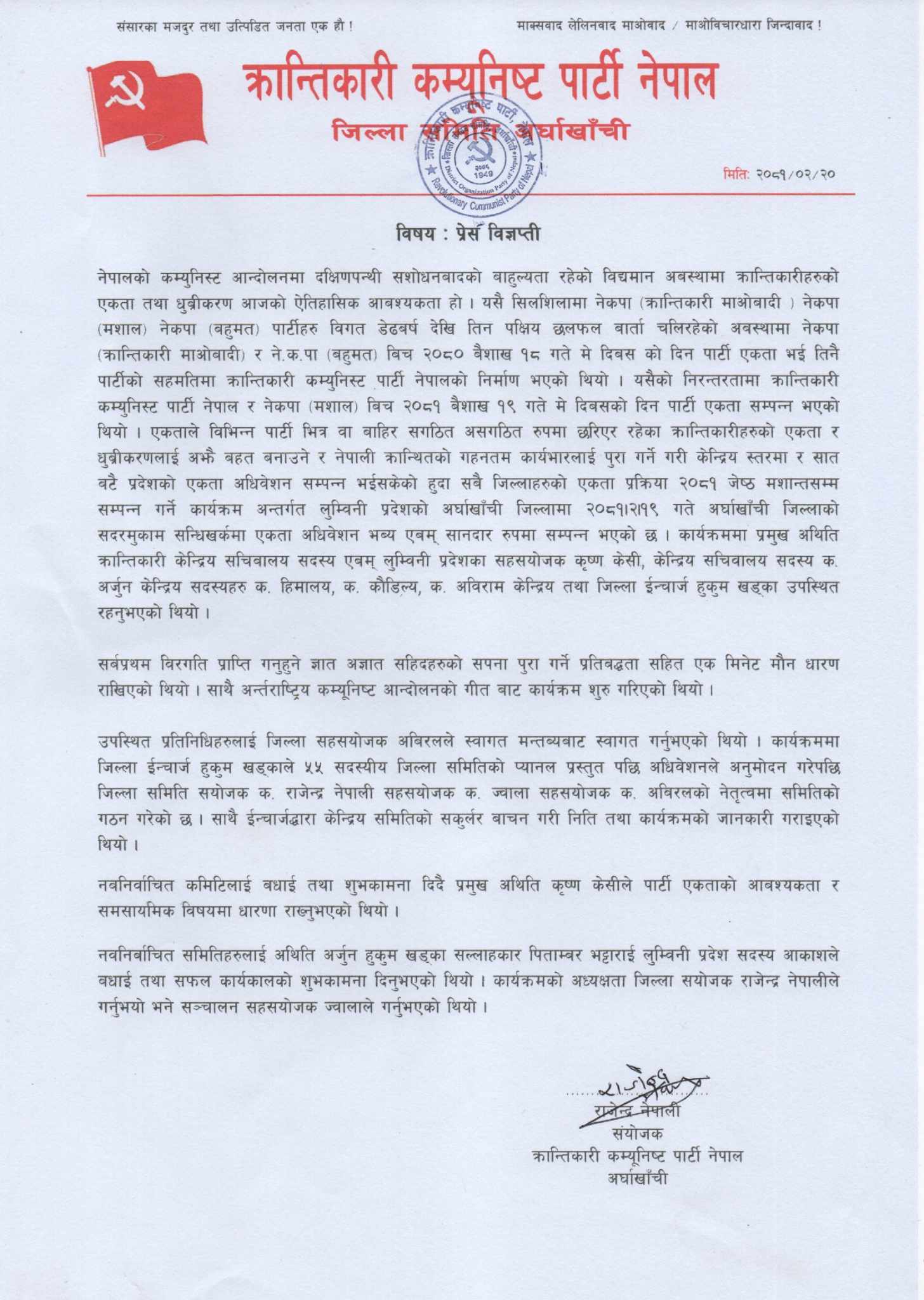 अर्घाखाँची : क्रान्तिकारी कम्युनिस्ट पार्टी नेपाल र नेकपा मशाल बीच अर्घाखाँची एकता अधिबेशन सम्पन्न।
