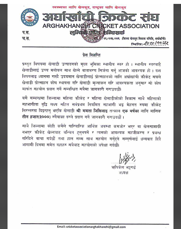 ११४ औं अन्तराष्ट्रिय महिला दिवसः नेपाल क्रिकेट संघ अर्घाखाँचीले खेल प्रतिभा ममता जि.सी.लाई प्रोत्साहन स्वरुप मासिक ३ हजार दिने