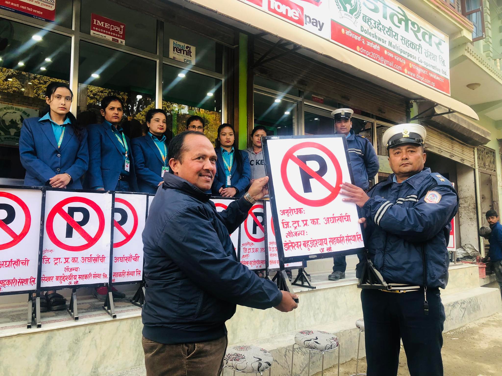 पार्किङलाई व्यवस्थित गर्न जिल्ला ट्राफिक कार्यालयलाई डोलेश्वर बहुउदेश्यीय सहकारीद्वारा विभिन्न ट्राफिक साङ्केतिक बोर्डहरु सौजन्य (तस्बिर सहित)