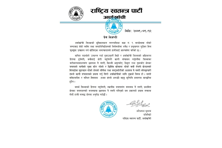 अर्घाखाँची भूमिकास्थान : चुन ढुङ्गा उत्खननका विरुद्ध राष्ट्रिय स्वतन्त्र पार्टी अर्घाखाँचीको विज्ञप्ति