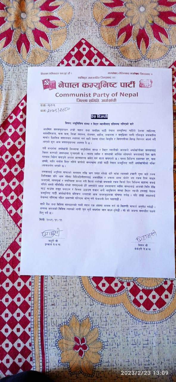 अर्घाखाची : लघु वित्तिय सस्था र मिटर ब्याजीलाई राेक लगाउनु पर्ने बताउदै बिप्लब नेतृत्वको नेपाल कम्युनिस्ट पार्टी द्वारा प्रेस विज्ञप्ति जारी ।