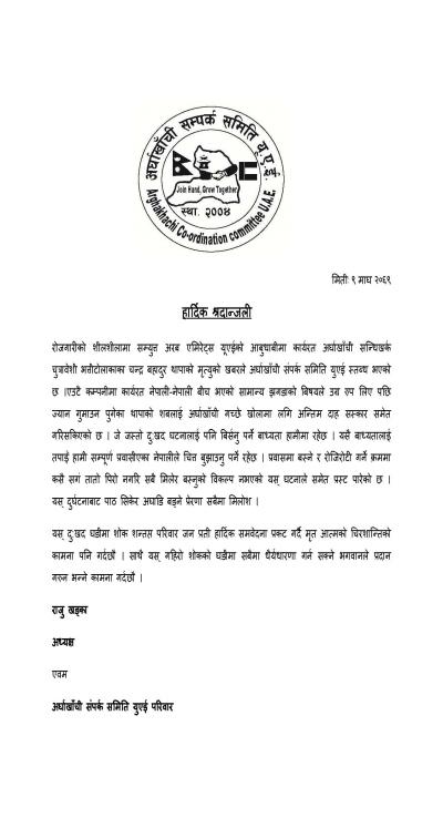 अर्घाखाँची संपर्क समिति युएईको भाबपूर्ण श्रदान्जली