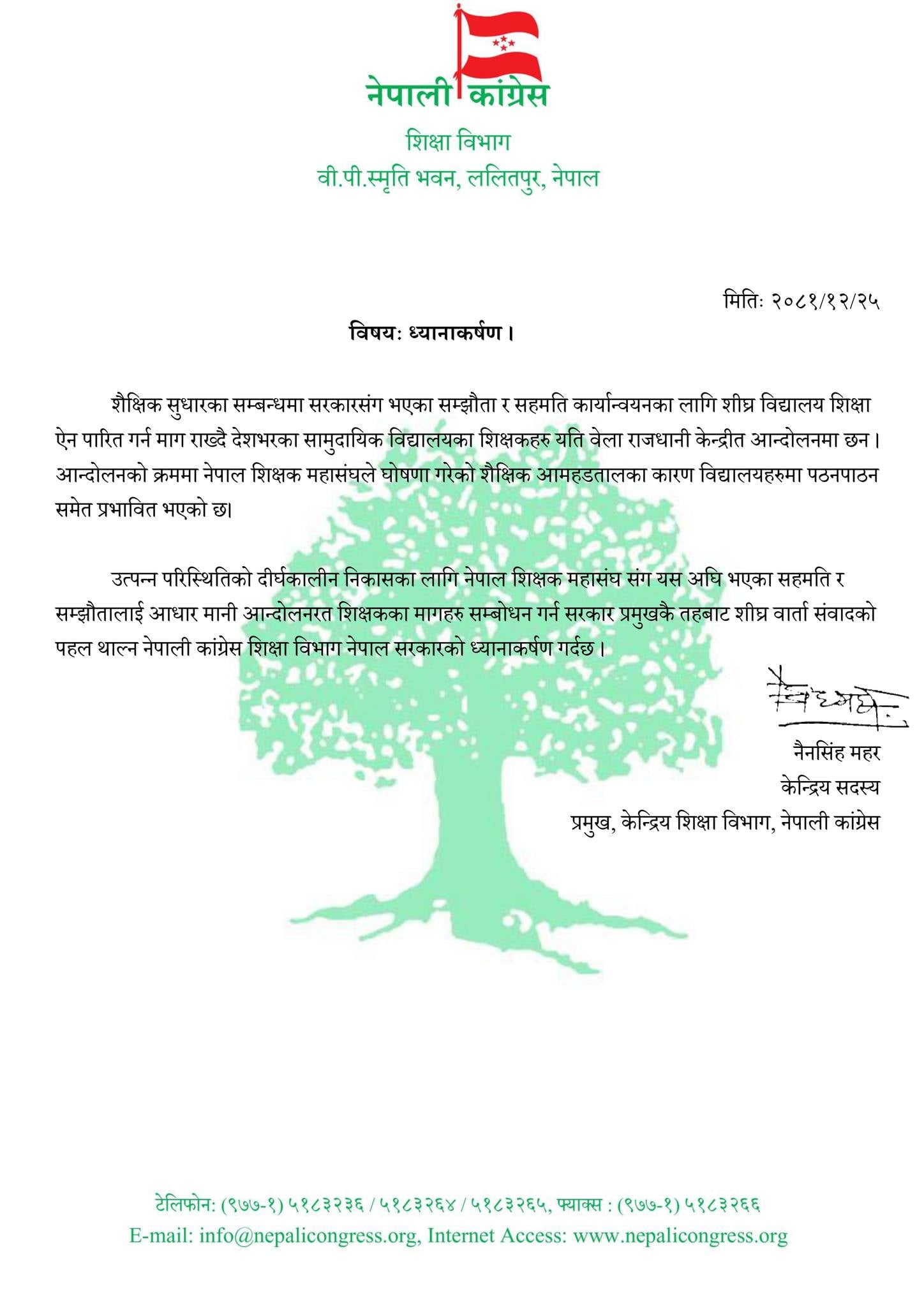 शिक्षकका माग सम्बोधन गर्न सरकार प्रमुखबाटै वार्ता पहल होस्ः कांग्रेस