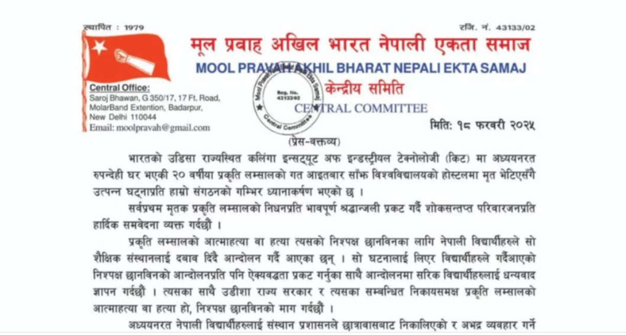 भारतीय विश्वविद्यालयमा नेपाली विद्यार्थीमाथि भएको विभेदको विरोधमा मुल प्रवाह अखिल भारत नेपाली एकता समाजद्वारा प्रेस विज्ञप्ति जारी