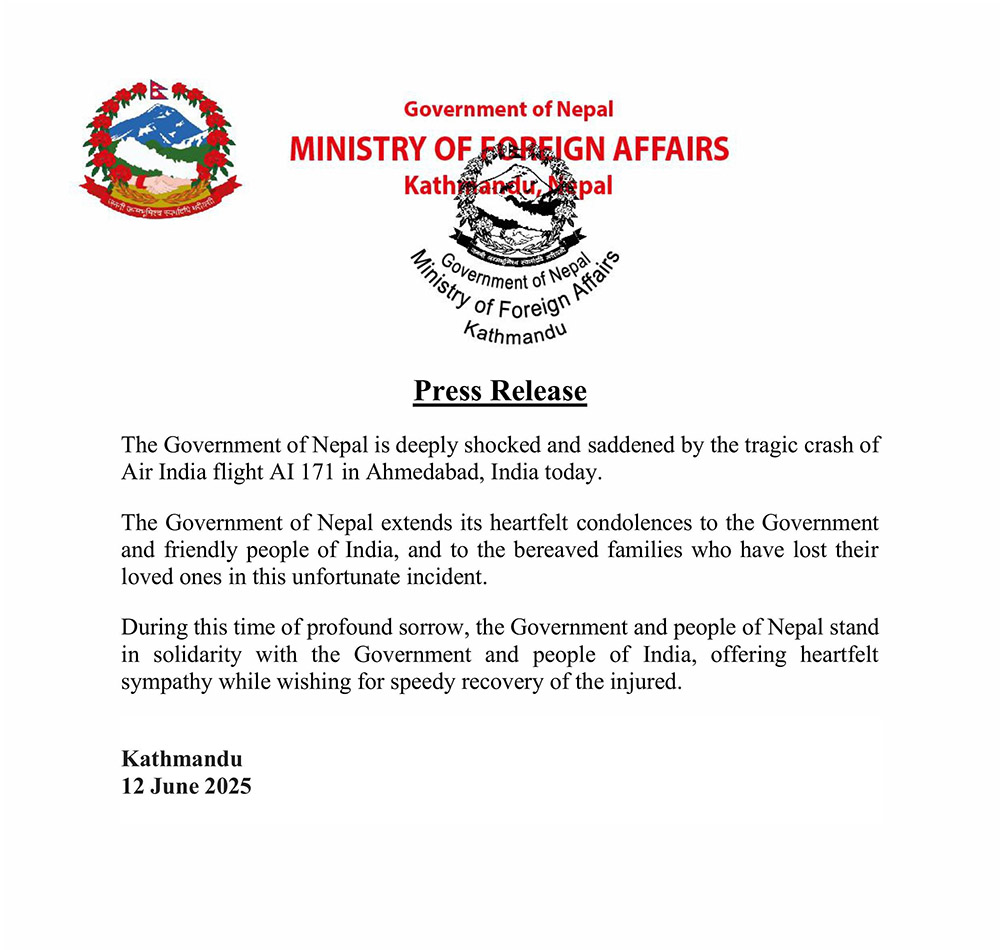 एयर इन्डियाको विमान दुर्घटनाप्रति नेपाल सरकारद्वारा दुख व्यक्त