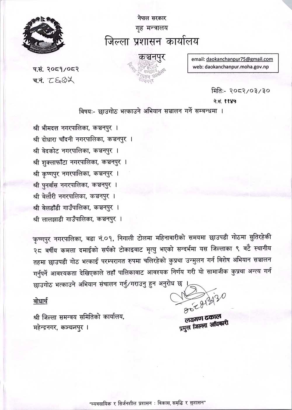 कञ्चनपुरका सबै छाउगोठ भत्काउन जिल्ला प्रशासनको निर्देशन