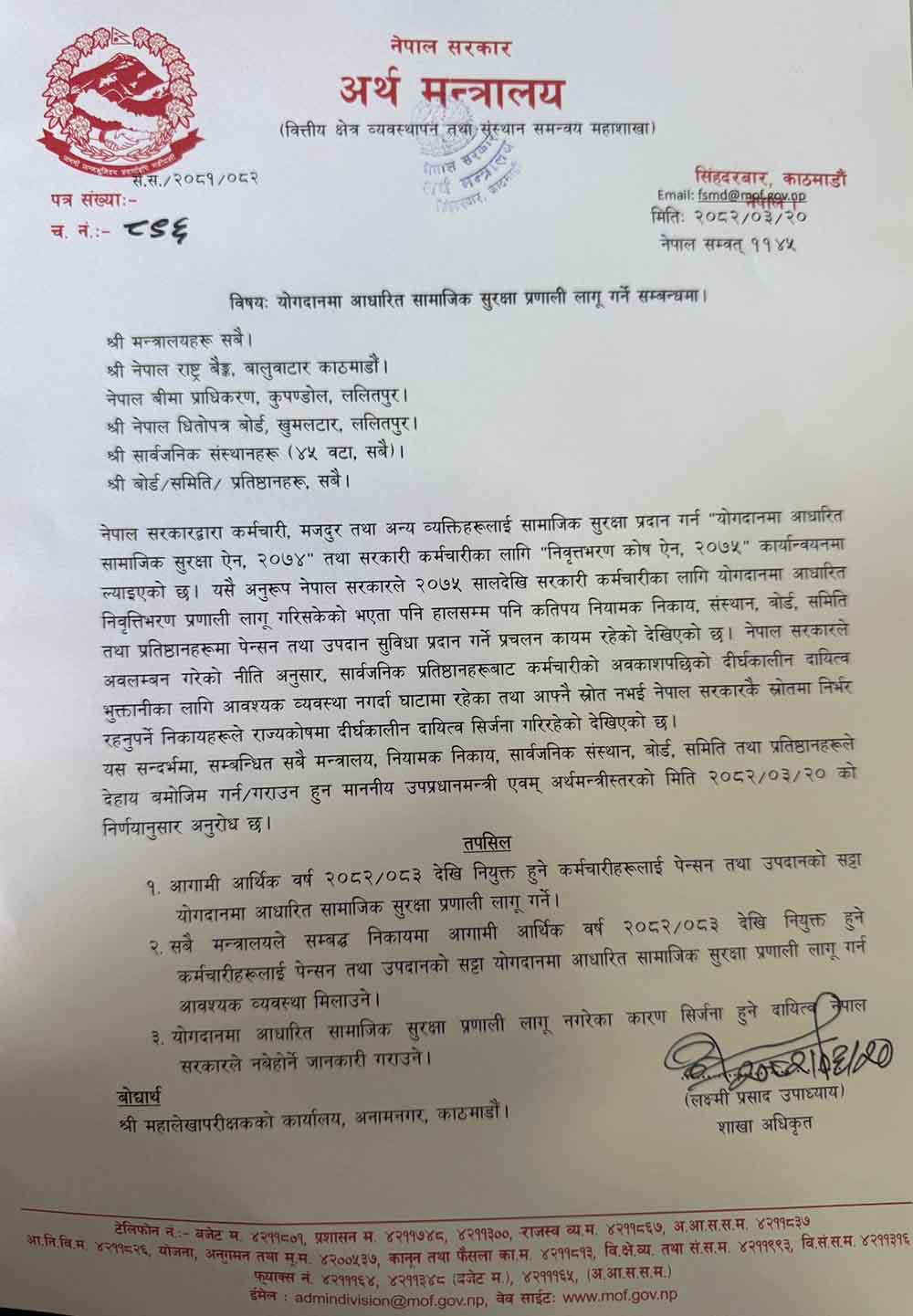 नयाँ नियुक्त हुने कर्मचारीलाई पेन्सन तथा उपदानको सट्टा योगदानमा आधारित सामाजिक सुरक्षा प्रणाली लागू हुने