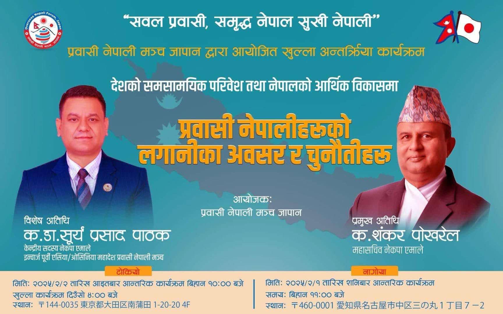 प्रवासी नेपाली मञ्च जापानले एमाले महासचिव शंकर पोखरेलको प्रमुख आतिथ्यतामा आन्तरिक प्रशिक्षण तथा खुल्ला अन्तरक्रिया कार्यक्रम गर्ने