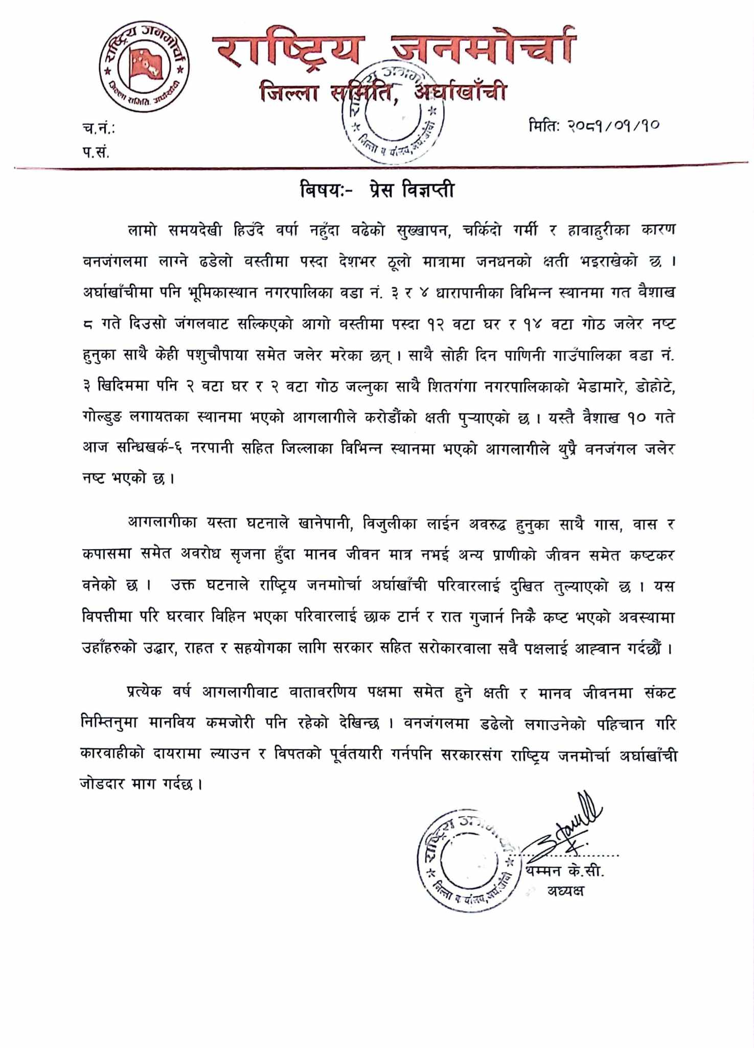 भूमिकास्थानः आगलागीले जलेका पिडित नागरिकका घर बनाउन राष्ट्रिय जनमोर्चाको आर्थिक सहयोग (तस्बिर सहित)