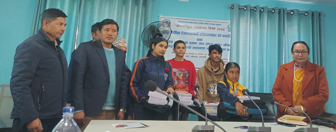 सुरक्षित, मर्यादित र सीपयुक्त आप्रवासनको प्रतिबद्धता: विदेशिने क्रममा ज्यान गुमाएका श्रमिकहरूका सन्तानहरूलाई शैक्षिक सामग्री हस्तान्तरण (तस्बिर सहित )