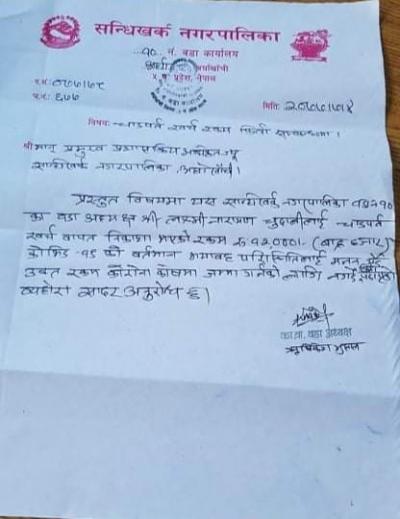सन्धिखर्क- १0 का वडाअध्यक्ष चुदालीद्धारा चाडपर्वको लागि पाएको भत्ता फिर्ता