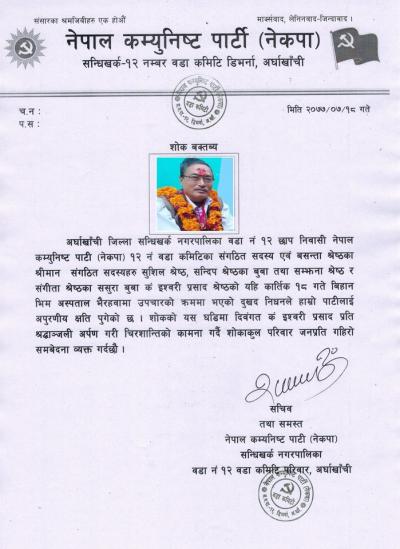 सन्धिखर्क नगरपालिकाका प्रमुख कमल भुसाललाई पत्नी शाेक