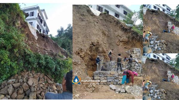 पहिरोको जोखिममा परेको खाँचीकोटको आदर्श माबि मैदान क्षेत्रमा पर्खाल निर्माण