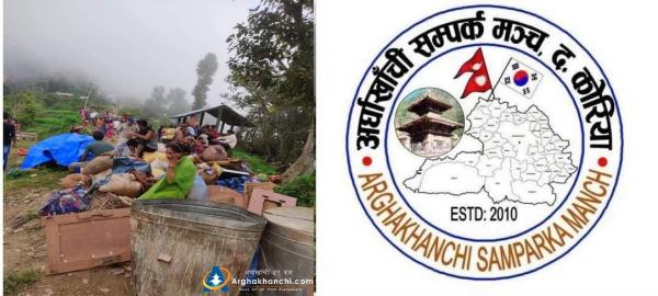 अर्घाखाँची सम्पर्क मञ्च दक्षिण कोरियाद्धारा ठाडाको कोठिया मैदानका पहिरो पिडितका लागि राहत संकलन गर्दै