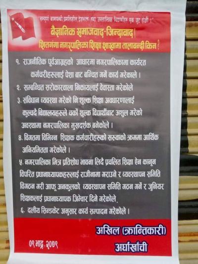 नेपाल कम्युनिस्ट पाटि बहुमतले शितगंगा नगरपालिकामा कालो ब्यानर सहित शिक्षा शाखामा लगायो ताला
