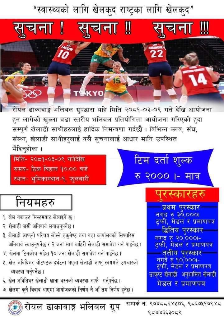 रोयल ढाकावाङ् भलिबल ग्रूपको आयोजनामा खुल्ला वडा स्तरीय भलिबल प्रतियोगिता हुने (सुचना सहित )
