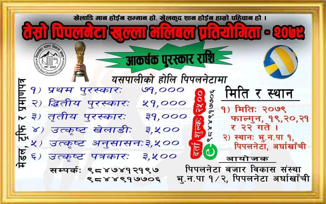 तेस्रो पिपलनेटा भलिबल प्रतियोगिता फागुन १९ गतेदेखि २२ गतेसम्म भुुमिकास्थान नगरपालिका १ ढाकाबाङ्गमा हुने