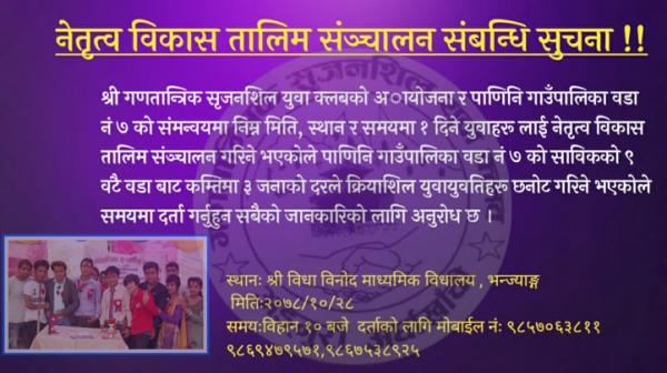अड्गुरीको भन्ज्याङ्गमा माघ २८ गते युवाहरूलाई १ दिने नेतृत्व विकास तालिम संञ्चालन गरिने