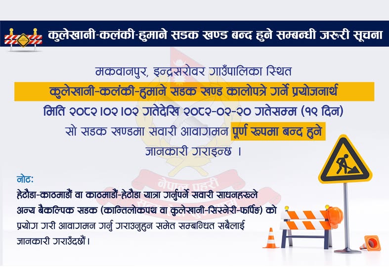 आज देखी कुलेखानी-कलंकी-हुमाने सडक खण्ड पुर्ण रूपमा बन्द