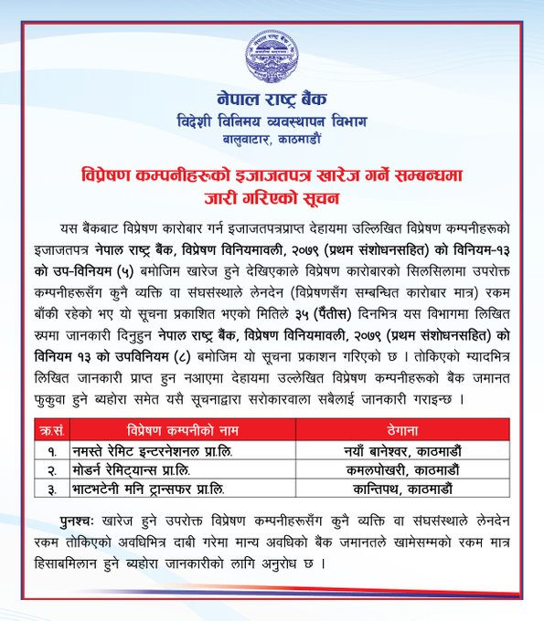 राष्ट्र बैंकले खारेज गरयो तीन रेमिटेन्स कम्पनि
