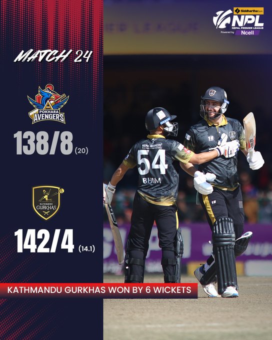 काठमाडाैंले एभेन्जर्सलाइ ६ विकेटले हराए पछि प्ले अफकाे सम्भावना बढयाे