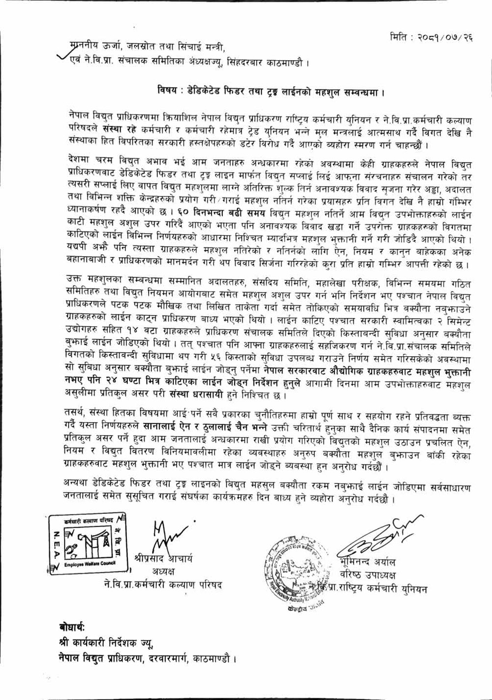 उद्योगमा विद्युतको लाइन जोड्ने सरकारको निर्देशनप्रति प्राधिकरणका कर्मचारीको चेतावनी