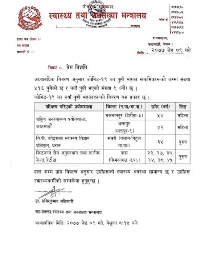 नेपालमा कोरोना भाइरस संक्रमितहरुको संख्या ५१६, मृतकको संख्या ३, डिस्चार्ज ७० जना