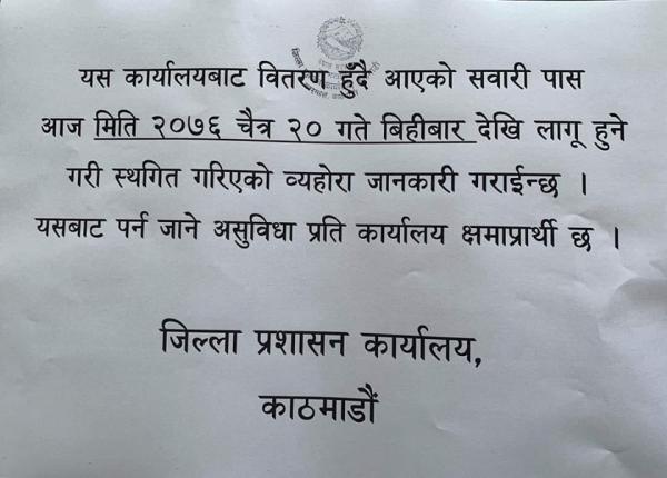 काठमाडौं र चितवनमा विशेष सवारी पास दिन बन्द