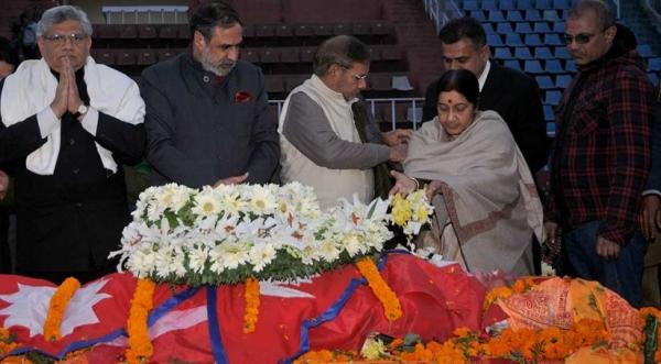 भारतीय विदेश मन्त्री सुष्मा स्वराजद्धारा पूर्व प्रधानमन्त्री स्वर्गिय सुशील कोइरालालाई अन्तिम श्रद्धाञ्जली व्यक्त