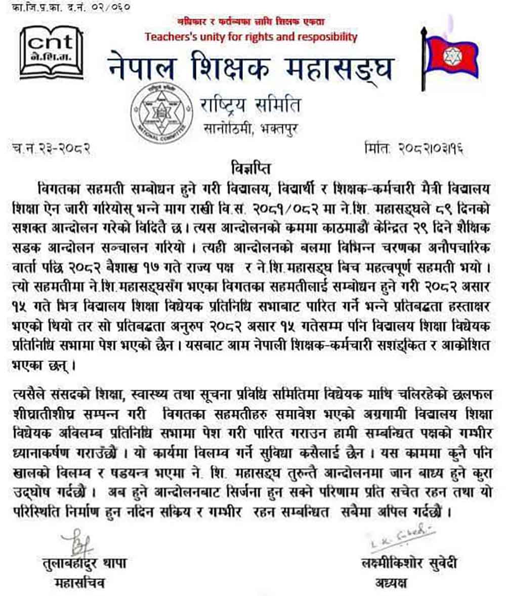 शिक्षक महासंघले दियो पुनः आन्दोलन गर्ने चेतावनी